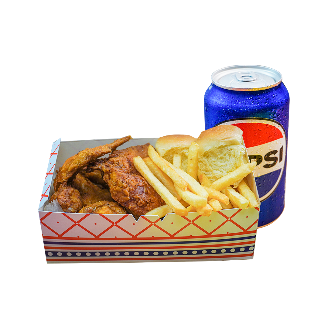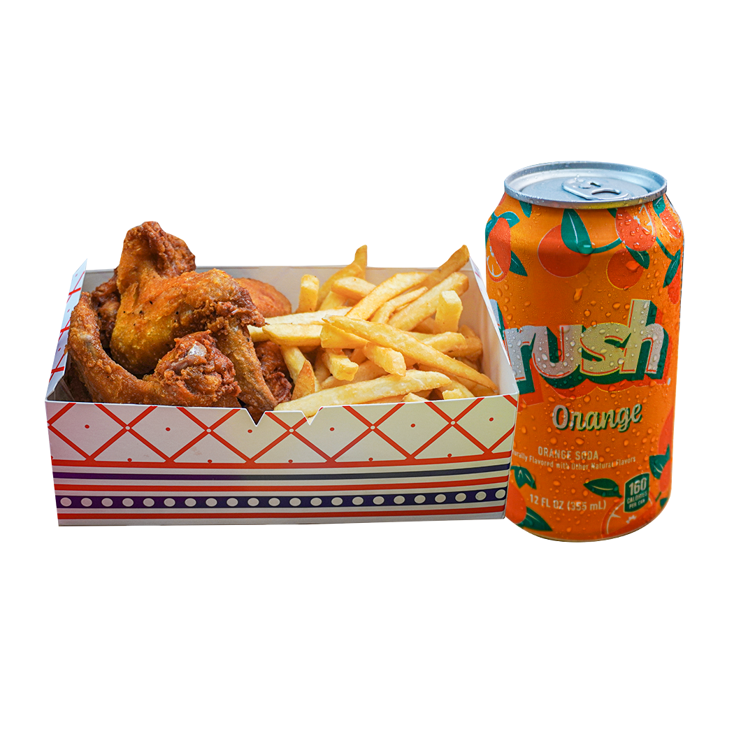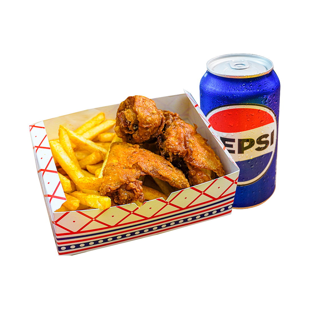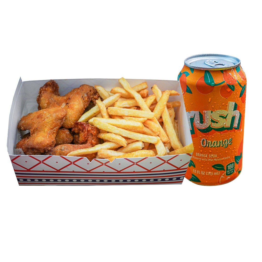 Crispy fried fish, spicy Buffalo wings, fries, and a can of soda—packed with bold flavors and crunch!